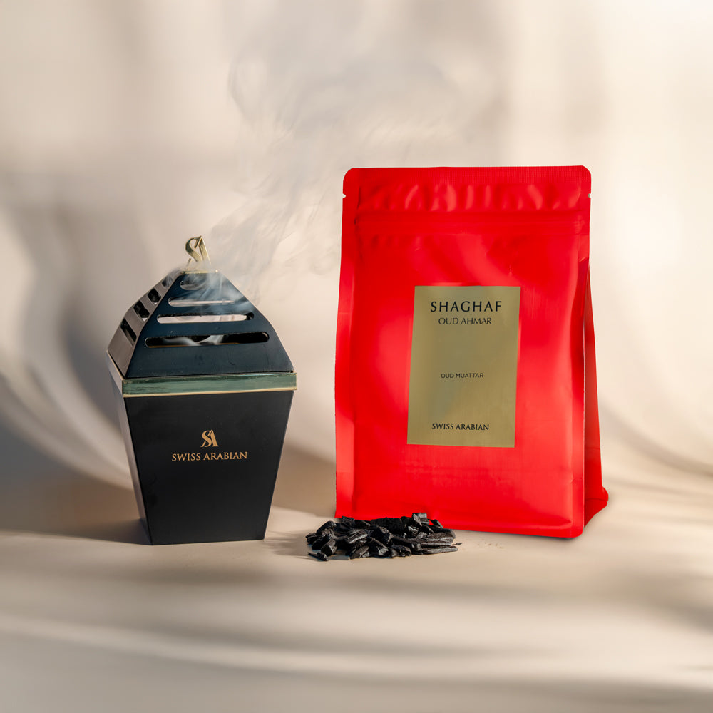 Shaghaf Oud Ahmar Muattar is a luxurious incense blend that elevates your space with the same opulent character as its perfume counterpart. As it smolders, the air fills with a graceful overture of sparkling bergamot, ripe melon, and sun-kissed peaches — a dazzling prelude of fruity elegance. Hints of soft iris and blooming freesia add a veil of sophistication, wrapping your senses in a silken embrace. As the muattar continues to release its essence, the heart opens into a delectable fusion of crisp apples and warm tonka bean, gently melting into a lush bouquet of velvety roses. The atmosphere becomes a fragrant dream, draped in golden vanilla, precious woods, and whispering powdery musks, a signature of refined beauty that lingers long after the embers fade. Shaghaf Oud Ahmar Muattar is not just incense, it is an immersive ritual of luxury that transforms your surroundings into a haven of timeless elegance.