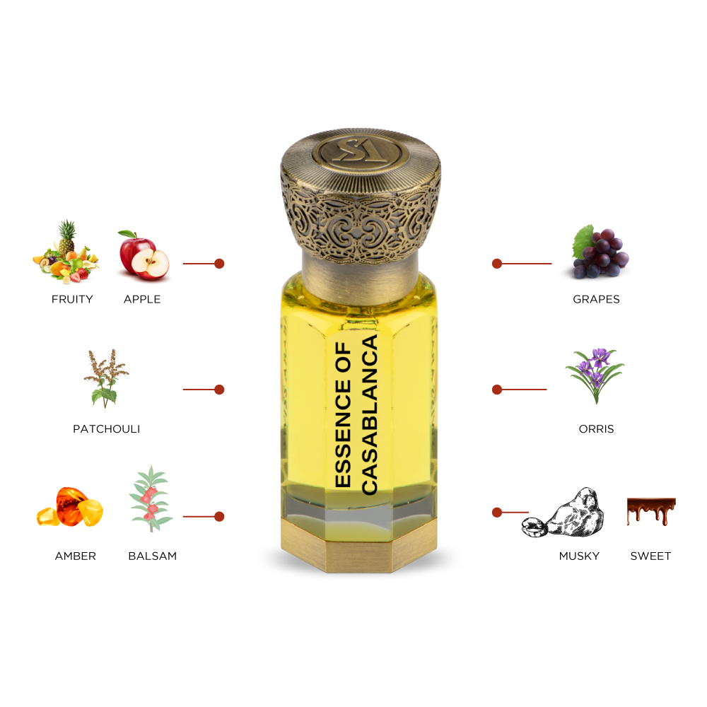 Essence Of Casablanca was inspired by the breath-taking city that rises from the desert sands of its heritage. When you wear Essence of Casablanca, you become a part of it. Its beauty is undeniable. Its elegance is assured. The legend is eternal. Essence of Casablanca opens with a tempting array of ripe fruits, beckoning you into this scented world. Apples and grapes offer color, juice and sweetness. You follow their beguiling scent towards intense patchouli and precious iris root. The fragrance surrounds you like the splendor of the city that inspired it; abundance, richness and grandeur combined. This intense heartbeat quickens until it is a steady, golden drum of sensual musk, deep, sweet balsams and a golden sunset of amber. Essence of Casablanca is a mystique to be discovered.