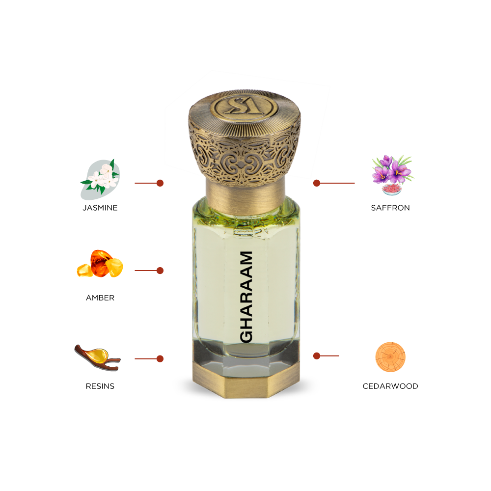 Gharaam means infatuation. It’s an ambry, aromatic, woody fragrance inspired by the first thrilling steps of love’s journey when eyes dance and hearts glow. Gharaam tempts you down an irresistible path with the narcotic aroma of precious jasmine petals, coupled with saffron, the rarest of all spices. A golden heart of amber embraces you. It sheathes you in gold and leads you, with an ever-quickening heartbeat into the thrilling forest territory of this new love, ready to be explored and cherished forever. The scent of cedar and pine fragrances your journey as you step into midnight with nothing to lose but your heart. Gharaam is a premium unisex fragrance which is especially suited to cooler seasons. Pure infatuation.