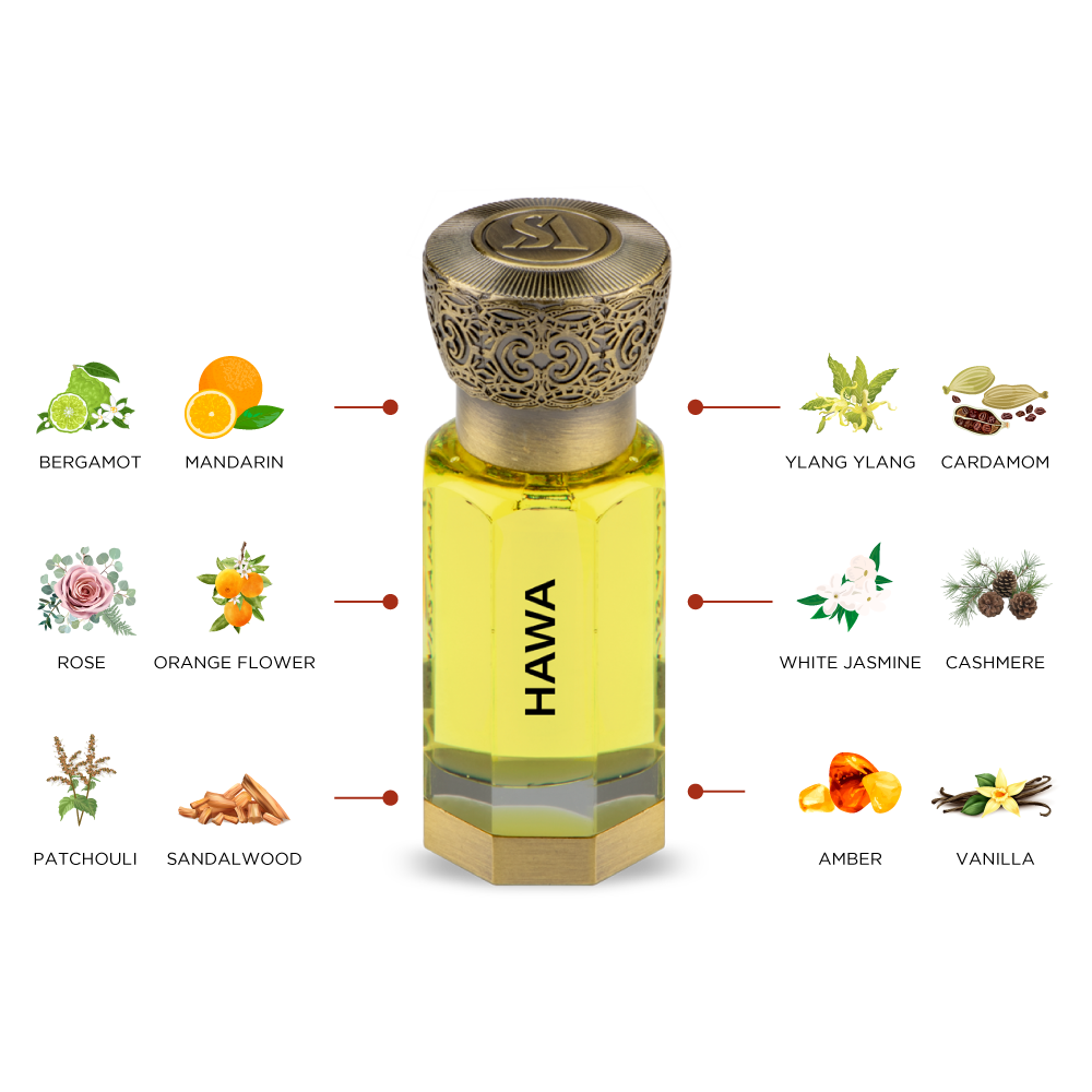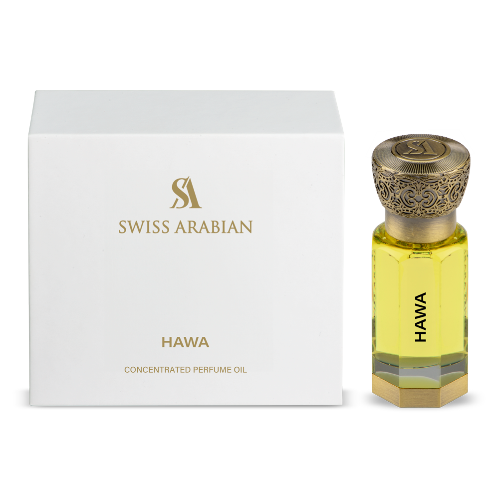 Hawa means desire. It’s inspired by the unique intensity of love’s yearning. The fragrance brings forth tempting fruits that sparkle with iridescence. You feel lightheaded with love as the most golden of sunlit bouquets surrounds you with a romantic floral heart of jasmine, orange flower and roses. The softest scent of cashmere caresses your skin with a shiver of pleasure. Intriguing patchouli and myrrh add the allure of temptation as they dance out of your reach, bringing you into the warmth of golden vanilla and exquisite sandalwood. Your heart’s desire.
