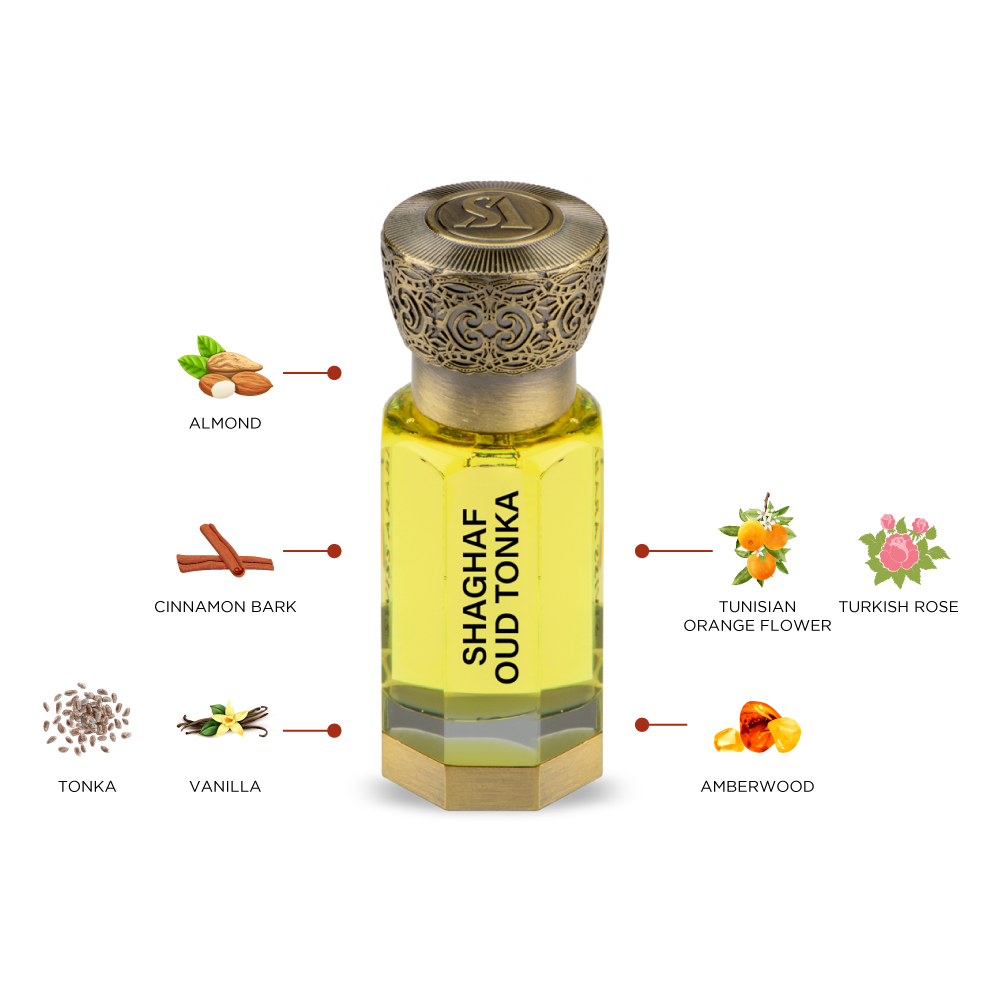 Step into a world of captivating elegance with Shaghaf Oud Tonka, a fragrance that unveils a mesmerizing blend of scents. The journey begins with the invigorating top note of almond, setting the stage for an enchanting experience. Feel the captivating embrace of cinnamon bark, Tunisian orange flower, and Turkish rose in the heart, as they intertwine to create a symphony of sensuality and allure. The base notes of tonka, vanilla, and amberwood add depth and richness, leaving a trail of captivating elegance. Tonka provides a warm and addictive embrace, while vanilla adds a touch of sweetness. Amberwood brings an earthy and woody allure, completing the captivating composition. Shaghaf Oud Tonka invites you to embrace the captivating elegance it embodies. Let its enchanting fusion of scents reflect your unique identity and celebrate your refined taste. Experience Shaghaf Oud Tonka and let its captivating allure leave a lasting impression.